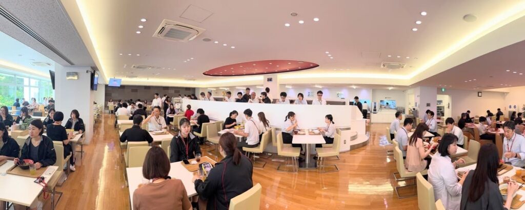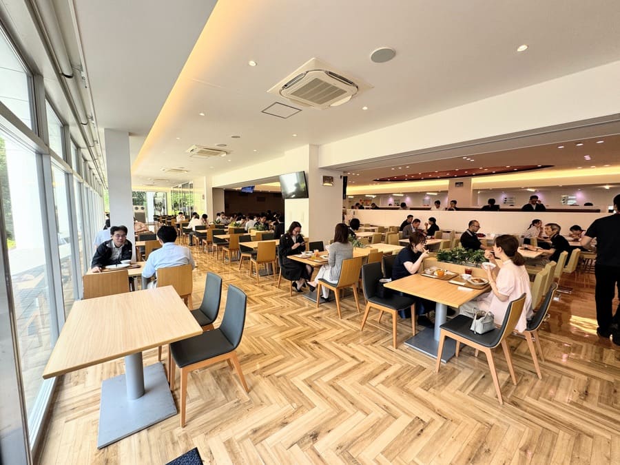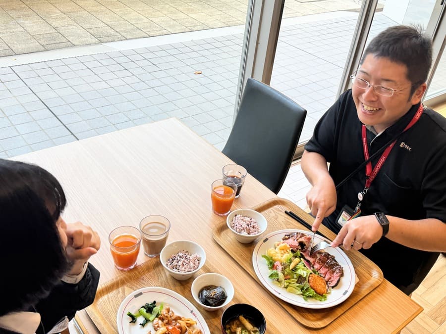 IDECの社員食堂「Sakura Café」は、単なる食事の場を超え、多様な人々が集い、社内交流を深める「開かれた空間」となっています。ガラス張りの食堂設計により、四季の中庭の緑が楽しめ、心身のリフレッシュを促進するだけでなく、食堂を利用するのは、社員はもちろん、役員や来訪者まで、あらゆる人が日常的に利用しており、部署の垣根を越えた賑やかなコミュニケーションが生まれています。福利厚生も充実しており、ジュースやコーヒーが無料で豊富に用意され、社員のリフレッシュをサポート。また、健康に配慮した朝食も提供しており、社員の食生活を力強く支えています。