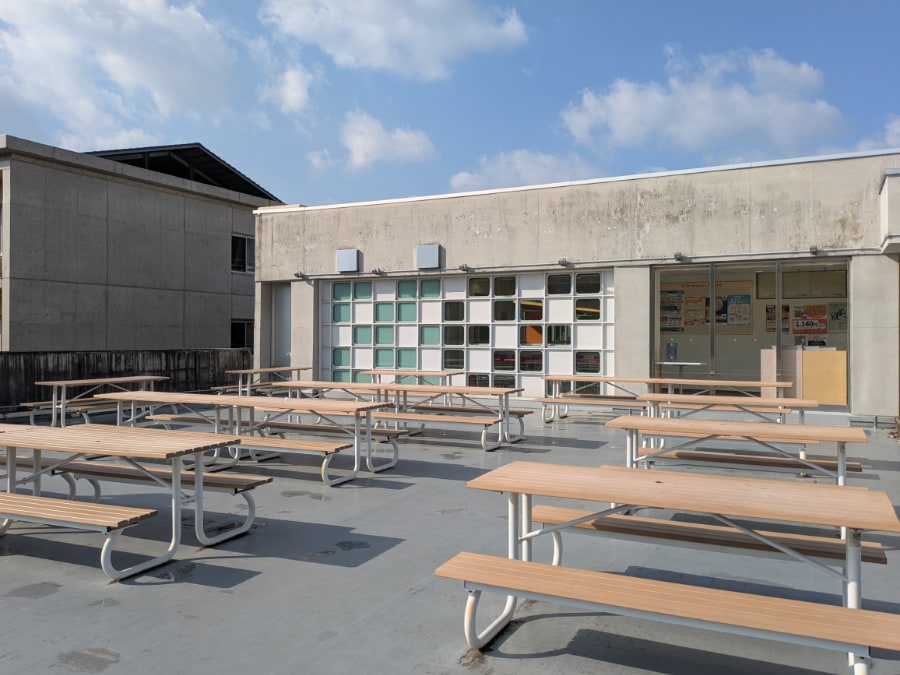 ピークを過ぎた夜、テラス席の灯りの下で語らう学生たちの傍らには、調理数の微調整によってフードロス削減にも配慮された、温かな食事が今日も並んでいます。